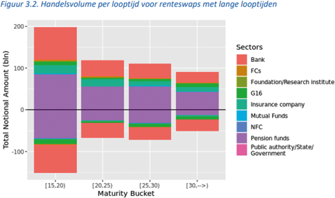 Uit deze data blijkt dat pensioenfondsen (in de grafiek weergegeven in paars) een aandeel van ongeveer 50% hebben in de gehele Nederlandse markt voor lange renteswaps.