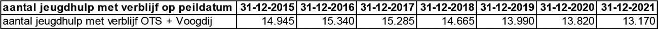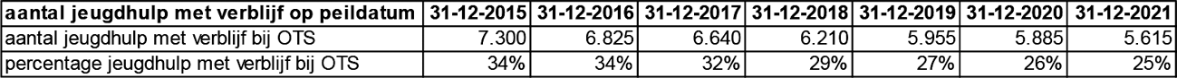 Als alleen gekeken wordt naar het aantal OTS-en (bij voogdij is nagenoeg altijd sprake van jeugdhulp met verblijf) dan zien we ook daar een daling in het aantal kinderen die op een bepaald moment jeugdhulp met verblijf ontvangen; van 7.300 kinderen op 31 december 2015 naar 5.615 kinderen op 31 december 2021. Er is niet alleen sprake van een daling in absolute aantallen, maar ook in relatieve aantallen (als percentage van het aantal kinderen met een maatregel voor OTS dat jeugdhulp met verblijf heeft). In relatieve zin gaat het om een daling van 34% op 31 december 2015 naar 25% op 31 december 2021.