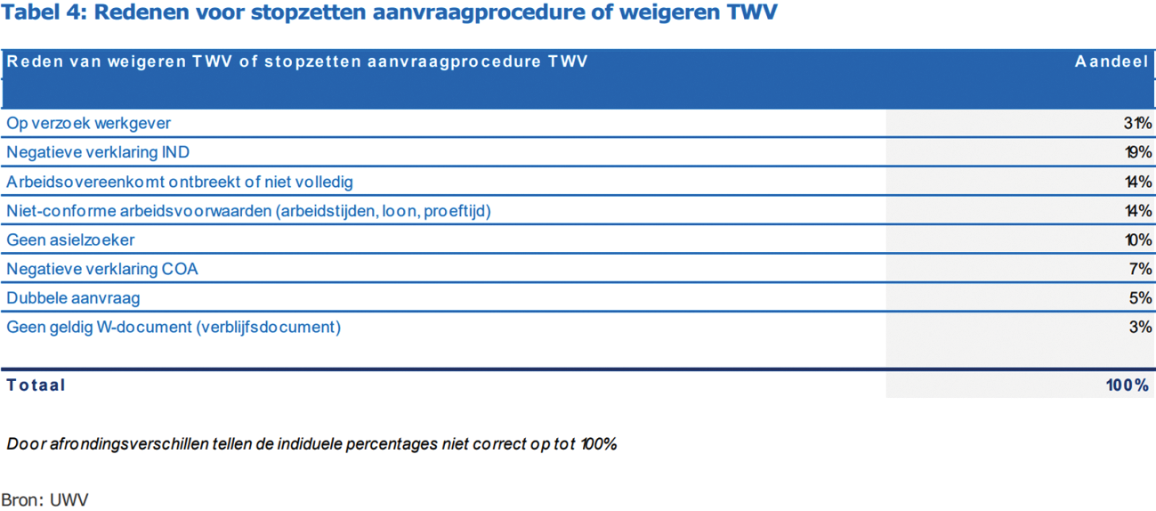 – Op verzoek werkgever: hierbij vindt vaak contact plaats tussen werkgever en UWV, waarna de werkgever besluit van de aanvraag af te zien. Dit kan verschillende redenen hebben. Het kan zijn dat de kandidaat geen asielzoeker is, of inmiddels statushouder is geworden (dan is arbeid vrij toegestaan en niet langer een tewerkstellingsvergunning vereist) of dat er een dubbele aanvraag is gedaan. Er is hierbij geen sprake van een afwijzing van de aanvraag, maar van een intrekking van de aanvraag door de werkgever die deze heeft ingediend. De aanvraag wordt dan niet verder in behandeling genomen (31%);