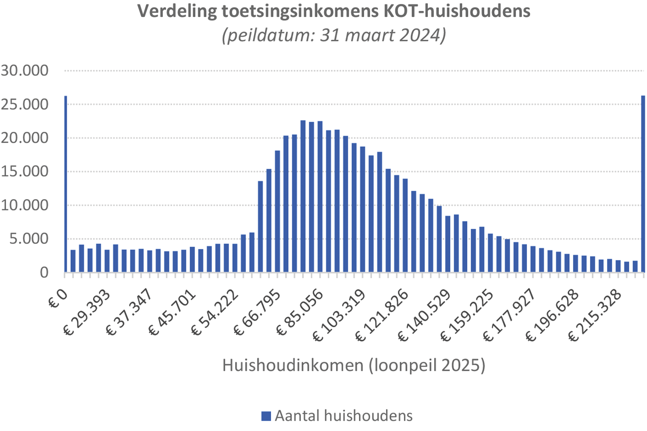 Bij het interpreteren van dergelijke rekenvoorbeelden is het belangrijk om inzicht te hebben in de werkelijke inkomensverdeling van huishoudens die kinderopvangtoeslag ontvangen. Daarom heb ik onderstaande grafiek opgenomen, die gebaseerd is op data van Dienst Toeslagen van peildatum 31 maart 2024. De grafiek maakt duidelijk dat het overgrote deel van de huishoudens met kinderopvangtoeslag een bovenmodaal toetsingsinkomen heeft.