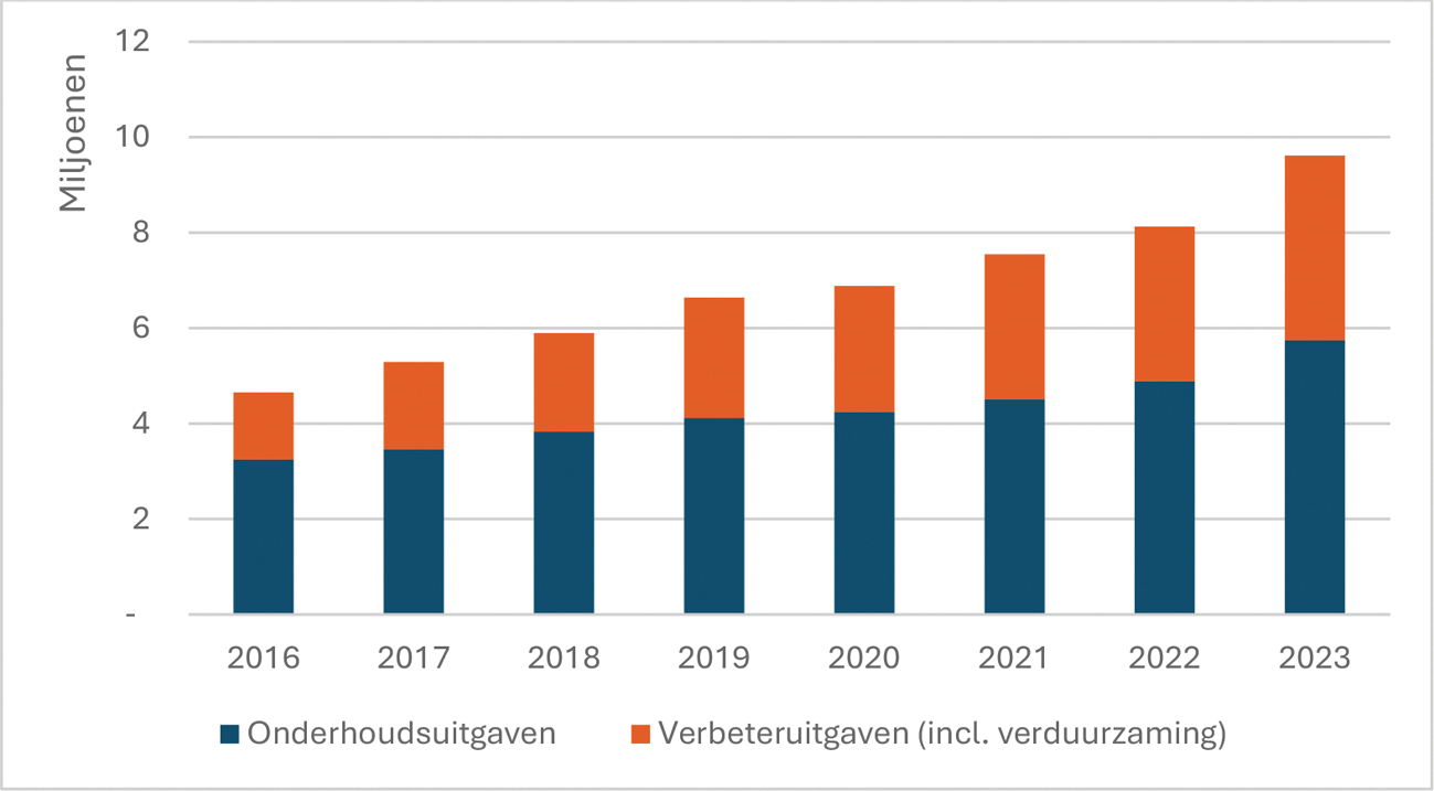 Corporaties investeerden in 2023 € 9,6 miljard in onderhoud, verbetering en verduurzaming van hun woningen, maar liefst € 1,5 miljard meer dan het jaar ervoor. Dat is 18,5% meer dan in 2022. Zo’n 5,6% is toe te schrijven aan de inflatie. De overige 12% komt doordat corporaties echt meer woningen hebben aangepakt.