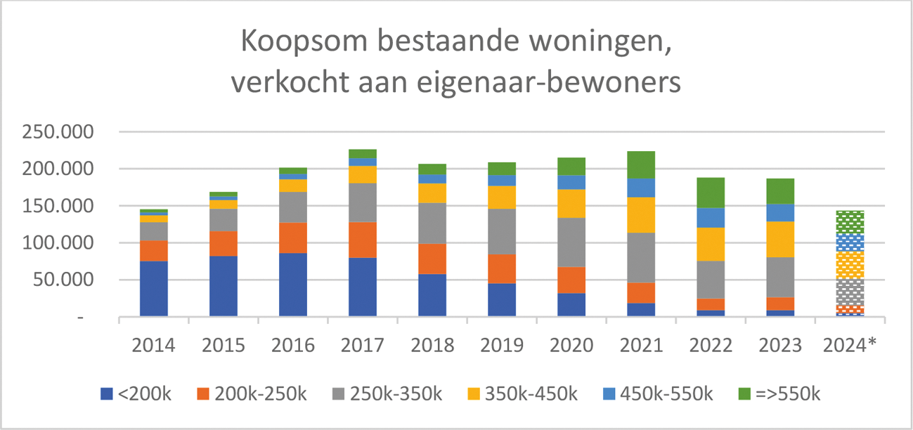 Op basis van cijfers van het Kadaster kan wel een onderverdeling in prijssegmenten worden gegeven van de verkoopprijzen van bestaande woningen over de afgelopen 10 jaar. Deze zijn hieronder weergegeven.