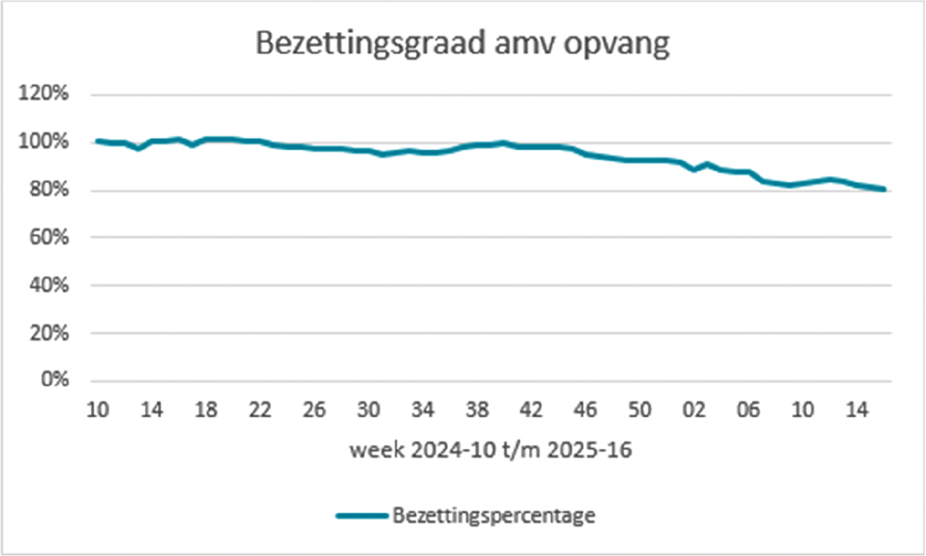 In onderstaande grafiek9 is het verloop van de bezetting op amv-locaties (regulier en noodopvanglocaties) weergegeven voor de afgelopen periode: