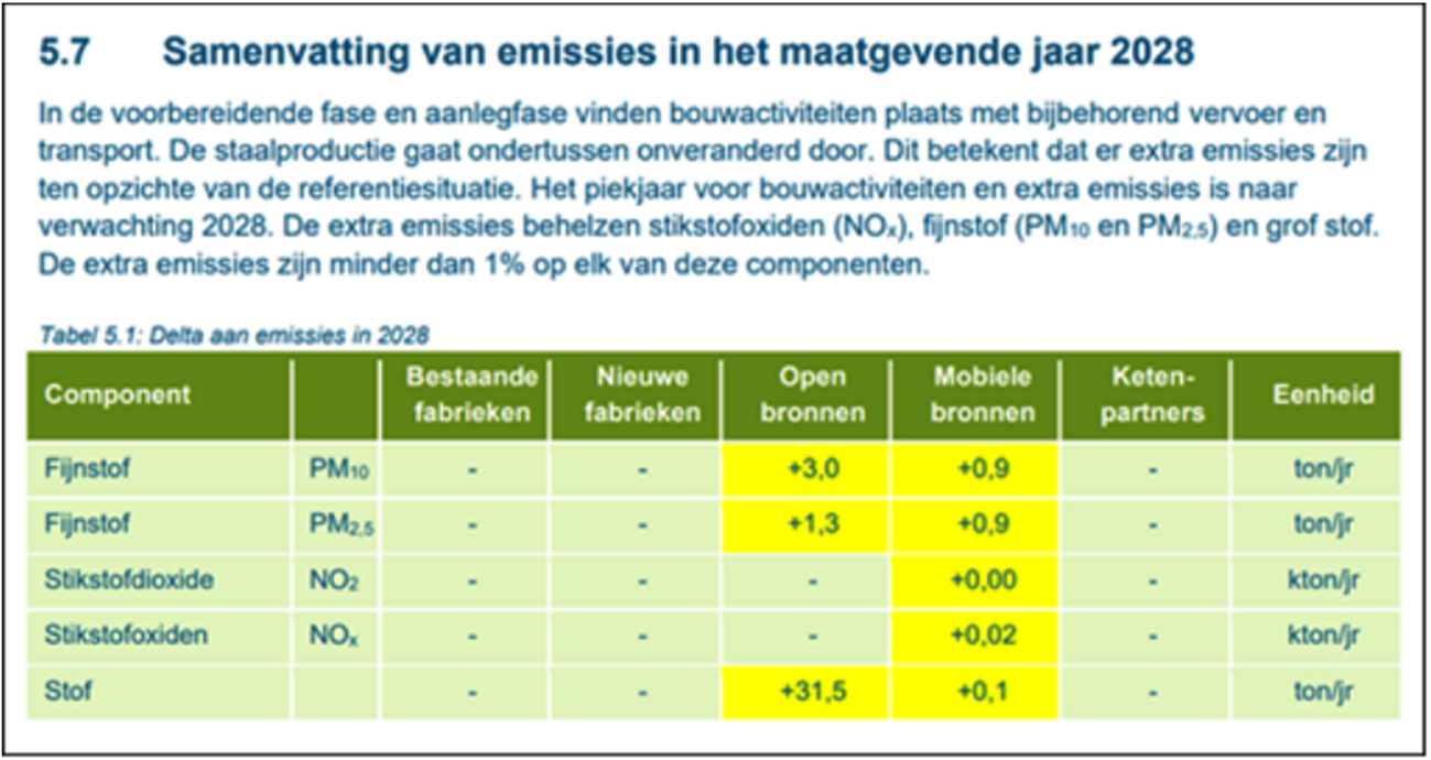 De toename in fijnstofemissies als gevolg van de bouwactiviteiten is voorzien op 3.9 ton/jr. Dit is volgens TSN een toename van minder dan 1%. Onderstaande tabel geeft voor fijnstof (PM10) de emissies aan over de verschillende fases zoals beschreven in het MER. Naast de realisatie van de nieuwe installaties die het MER beschouwt zal TSN ook aanvullende maatregelen nemen om fijnstof verder te reduceren. Dit betreft het bouwen van overkappingen en een windbreker bij de grondstofvelden en het treffen van maatregelen in de verwerking en opslag van staalslakken. Deze volgen een aparte vergunningsprocedure en zijn daarom geen onderdeel van het MER voor Groen Staal.