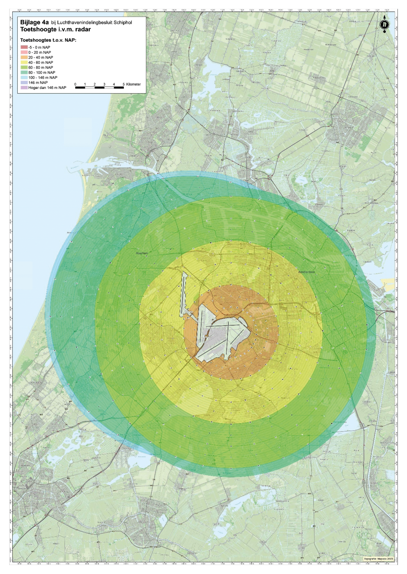 • Actualisatie van de maatgevende kaart toetshoogtes (bijlage 4) naar aanleiding van wijzigingen met betrekking tot communicatie- en navigatieapparatuur van Schiphol en de inkorting van baan 06-24 aan de noordoostzijde;