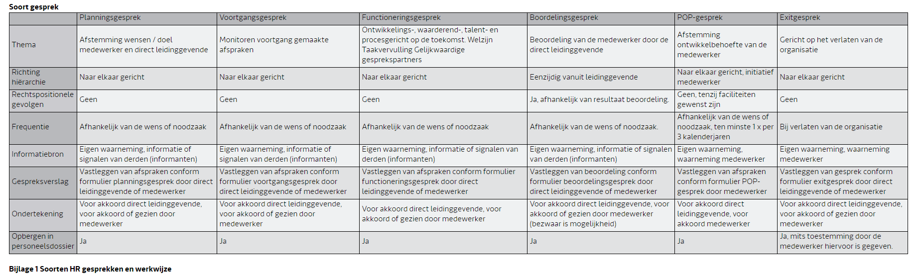 Daar waar een formeel besluit moet worden genomen kan een ander HR gesprek worden ingezet door de direct leidinggevende. Die gesprekken worden volgens een standaard formulier gehouden en vastgelegd.