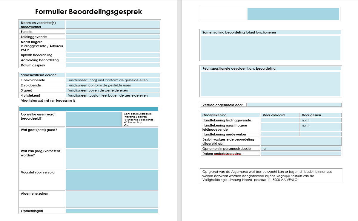 De Regeling personeelsbeoordeling Veiligheidsregio Limburg-Noord is van toepassing. Het resultaat van het beoordelingsgesprek kan leiden tot rechtspositionele gevolgen. Dit kunnen zowel positieve (bijv. verlenging/ vaste aanstelling, functionele schaal etc) als negatieve gevolgen (bijv. disfunctioneren of disciplinair) zijn. Als er sprake is van rechtspositionele gevolgen wordt dit schriftelijk aan de medewerker medegedeeld middels een apart besluit.