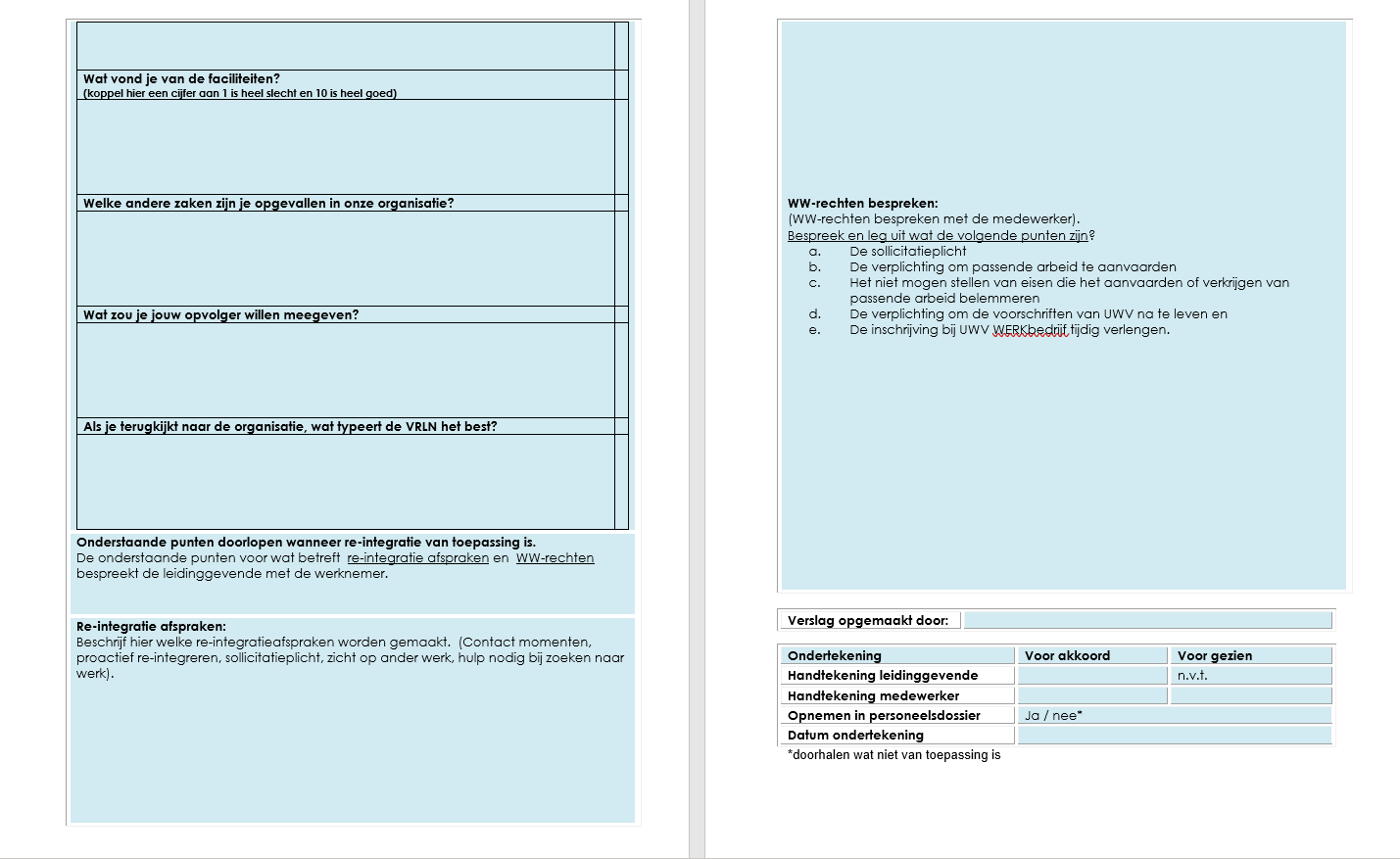De direct leidinggevende of medewerker maakt een kort verslag van het exitgesprek met behulp van het formulier exitgesprek. Het verslag wordt ondertekend door de direct leidinggevende (voor akkoord) en de medewerker (voor akkoord of voor gezien). Dit verslag vormt een onderdeel van het personeelsdossier, mits hiervoor door de medewerker toestemming is gegeven.