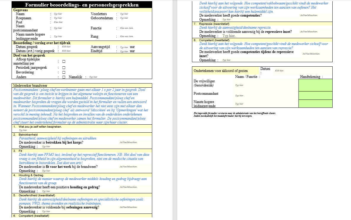 Voor de brandweervrijwilligers (manschappen/bevelvoerders) geldt een apart vereenvoudigd beoordelingsformulier, aangezien zij onder een eigen rechtspositie hoofdstuk 19 vallen en worden buiten de schematisch overzicht gehouden. Voor de koude leidinggevende functies van vrijwillig postcommandant kan de reguliere HR gesprekscyclus worden gebruikt.