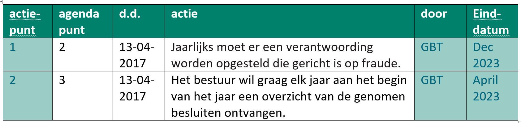 Doorlopende en/of terugkerende actiepunten