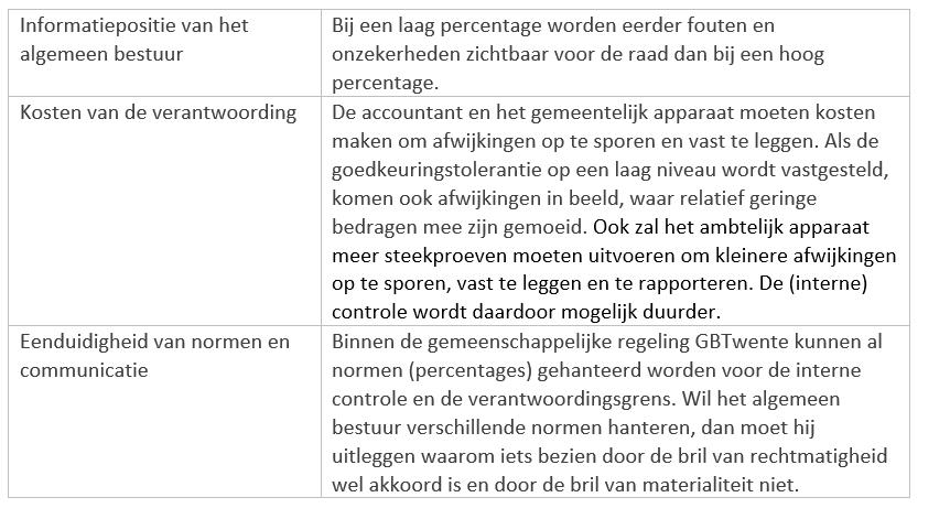 De bovengrenzen van de goedkeuringstoleranties zijn 1% van de omvangsbasis voor de fouten in de jaarrekening en 3% van de omvangsbasis voor de onzekerheden in de controle. De gemeenschappelijke regeling GBTwente kiest ervoor om aan te sluiten bij deze bovengrenzen en de bestaande werkwijze. Het algemeen bestuur heeft evenwel de mogelijkheid deze percentages verder aan te scherpen, dat wil zeggen op een lager percentage dan 1% of 3% zetten. Daarbij kunnen de volgende overwegingen in acht worden genomen:
