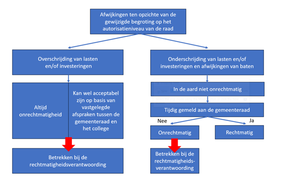 In dit artikel zijn de stellige uitspraken uit de Kadernota Rechtmatigheid van oktober 2024 opgenomen. In lid 4 en lid 5 wordt beschreven hoe omgegaan moet worden met afwijkingen. De overschrijdingen van lasten en investeringsbudgetten worden in lid 4 benoemd. De onderschrijdingen van lasten en investeringsbudgetten én onder- of overschrijdingen van baten zijn in lid 5 opgenomen. In de Kadernota rechtmatigheid van oktober 2024 is dit als volgt schematisch weergegeven: