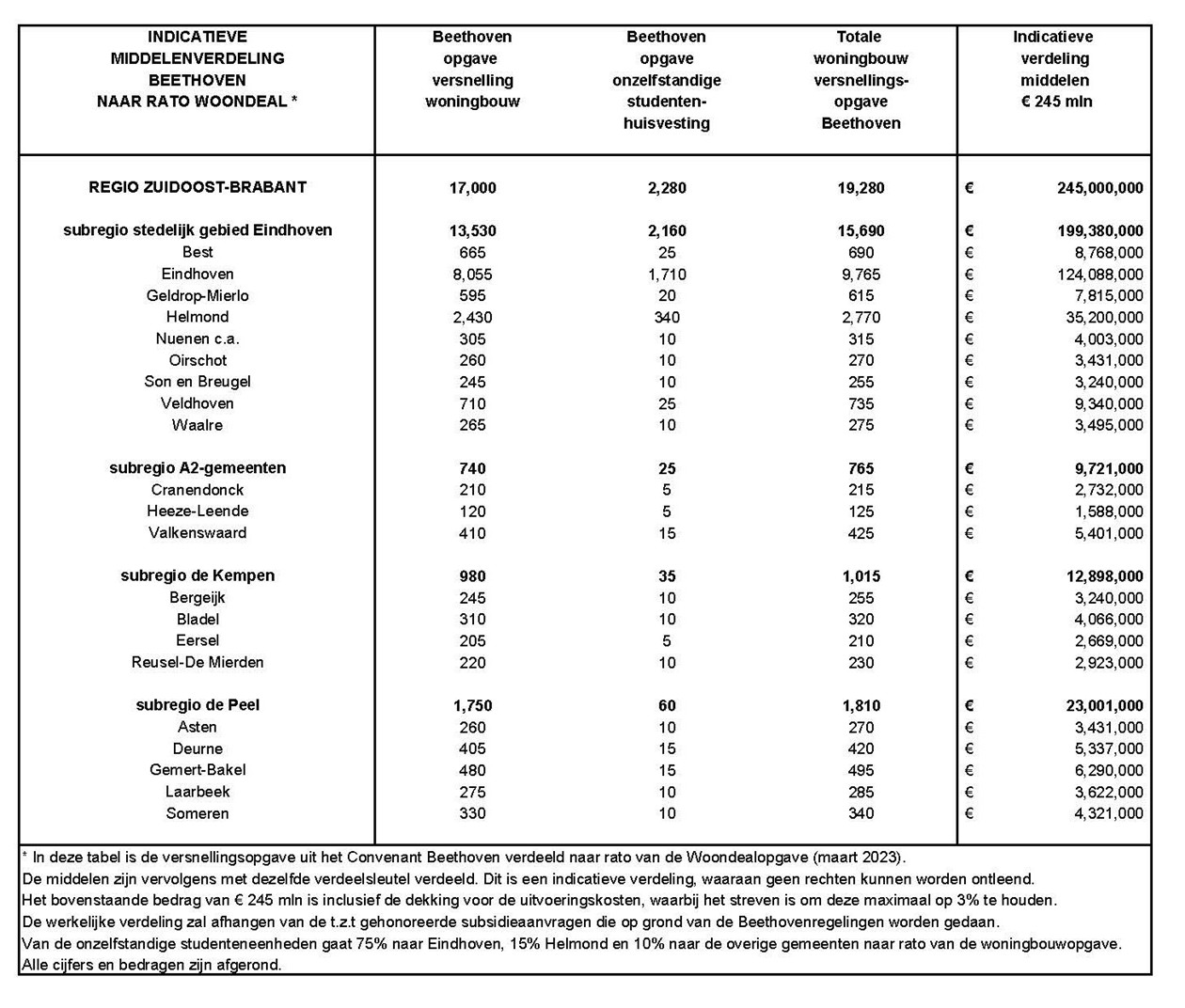 Verdeling van de beschikbare Beethoven convenant middelen per gemeenten