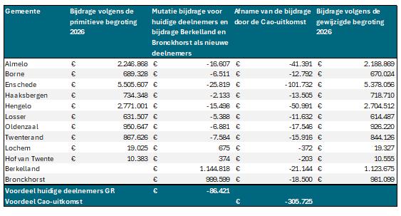 Ook is begin juni 2025 de uitkomst van de Cao-onderhandelingen bekend geworden. De loonstijgingen volgens het eindakkoord liggen lager dan de loonindex, die op advies van de Twentse werkgroep Financiën van de deelnemende gemeenten, in de ontwerp begroting 2026 is verwerkt. De vrijval aan loonsom vanuit de Cao is tevens verwerkt in deze gewijzigde begroting.