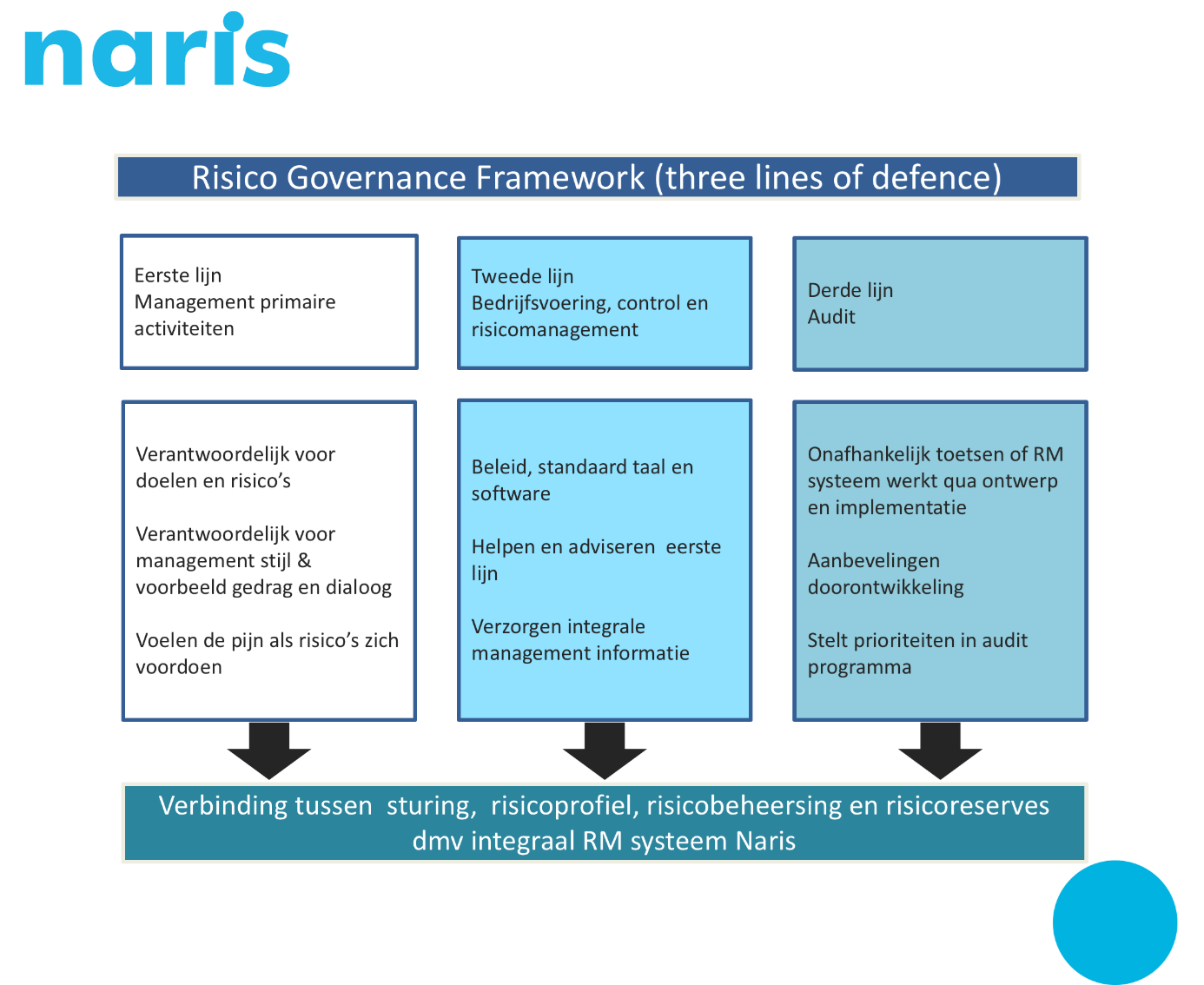 De ‘business’ (1st line of primair proces) is eindverantwoordelijk voor de keuzes die ze maken en de risico’s die ze in de dagelijkse praktijk aangaan. Zij kunnen de risicobeheersing dus nooit delegeren. De eerste lijn is daarmee de belangrijkste vorm van risicobeheersing. Als het de organisatie dus zou lukken om de eerste lijn intrinsiek gemotiveerd te maken om de doelstellingen scherp te hebben, te reflecteren, regelmatig de risicodialoog te voeren en te vragen naar incidenten en hiervan te leren, dan is dat de beste vorm van risicobeheersing.