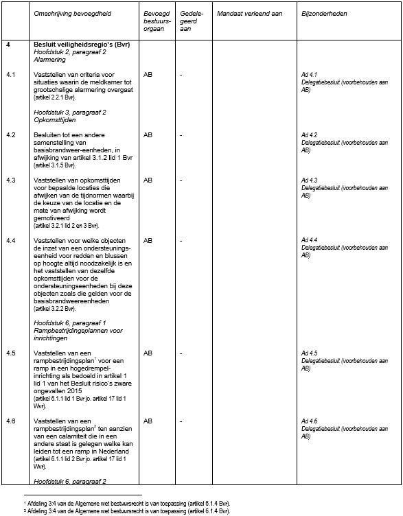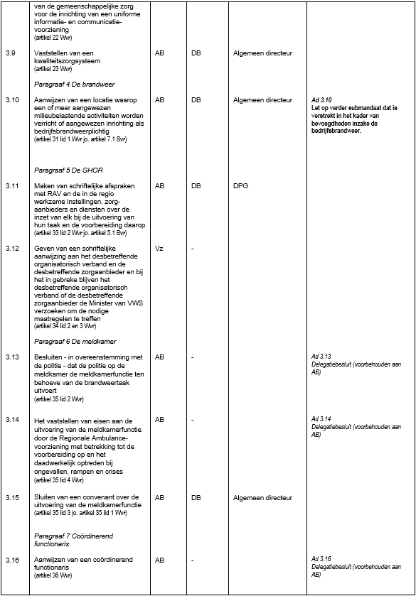 Het dagelijks bestuur verleent mandaat, volmacht respectievelijk machtiging (hierna te noemen: mandaat) aan de directeur publieke gezondheid om besluiten te nemen betreffende de in de bijgevoegde hoofdstukken genoemde bevoegdheden, het verrichten van daarmee verbonden rechtshandelingen en het verrichten van daarmee samenhangende feitelijke handelingen, voor zover deze besluiten uitsluitend betrekking hebben op GHOR-aangelegenheden.