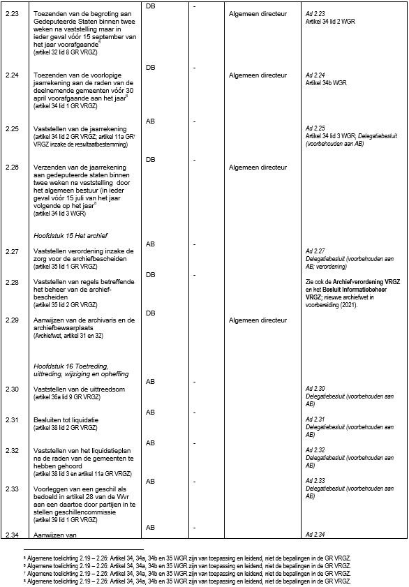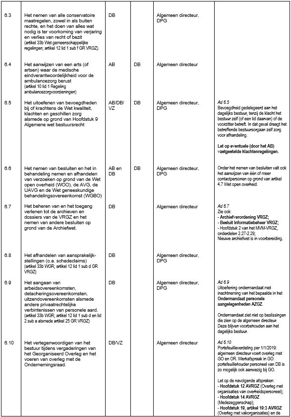 Het dagelijks bestuur verleent mandaat, volmacht respectievelijk machtiging (hierna te noemen: mandaat) aan de algemeen directeur om besluiten te nemen betreffende de in de bijgevoegde hoofdstukken genoemde bevoegdheden, het verrichten van daarmee verbonden rechtshandelingen en het verrichten van daarmee samenhangende feitelijke handelingen, die betrekking hebben op alle onderdelen van de VRGZ.