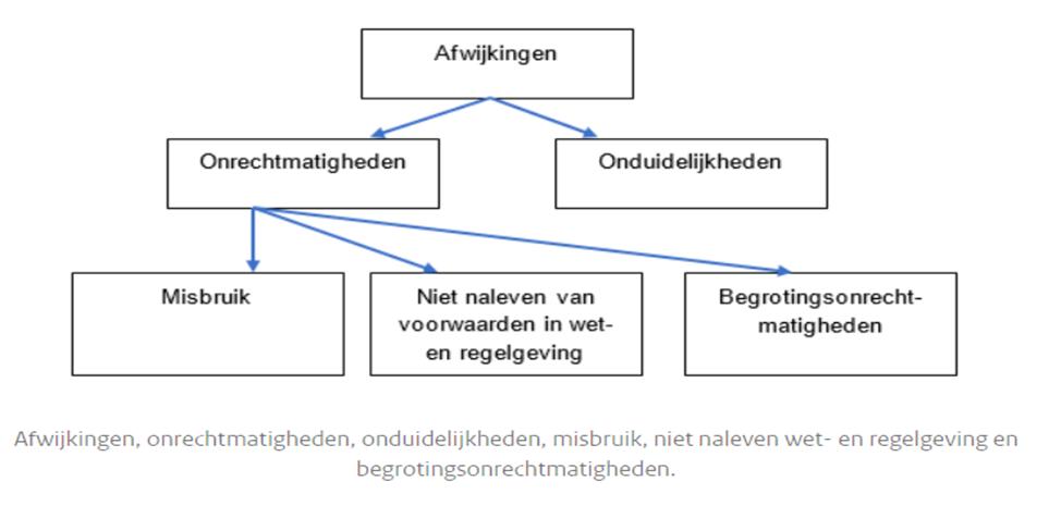 Onder afwijkingen wordt afzonderlijk verstaan rechtmatigheidsfouten (dus het niet naleven van wet- en regelgeving) en posten waarvan bij het Dagelijks Bestuur onduidelijkheid bestaat over de rechtmatigheid, omdat deskundigen en adviseurs (bijvoorbeeld juristen) van mening verschillen over de rechtmatigheid van een financiële beheershandeling die ten grondslag ligt aan baten en lasten en balansmutaties (onduidelijkheden). Voor zowel rechtmatigheidsfouten als voor onduidelijkheden afzonderlijk geldt hetzelfde percentage. Fouten en onduidelijkheden mogen daarbij niet bij elkaar worden opgeteld.