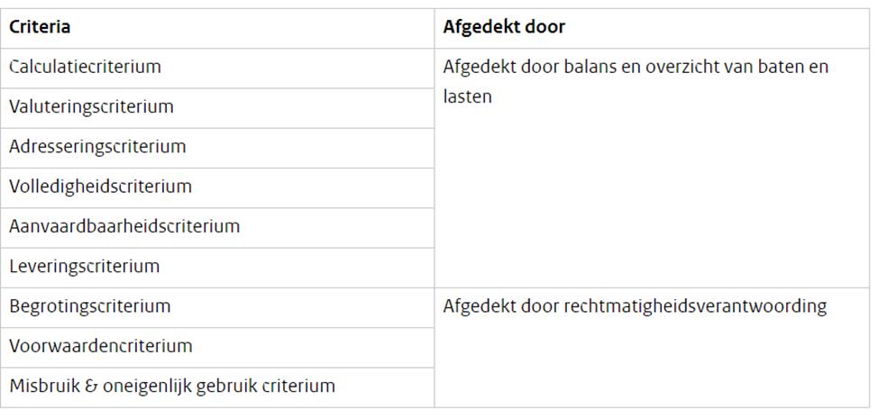 Omdat de eerste zes criteria worden afgedekt door het getrouwe beeld (accountantscontrole) hoeven deze reden niet afzonderlijk vermeld te worden in de rechtmatigheidsverantwoording. Vanzelfsprekend maken deze eerste zes criteria wel onderdeel uit van de reguliere jaarrekeningcontrole van de accountant. In het onderstaande schema is dit in beeld gebracht.