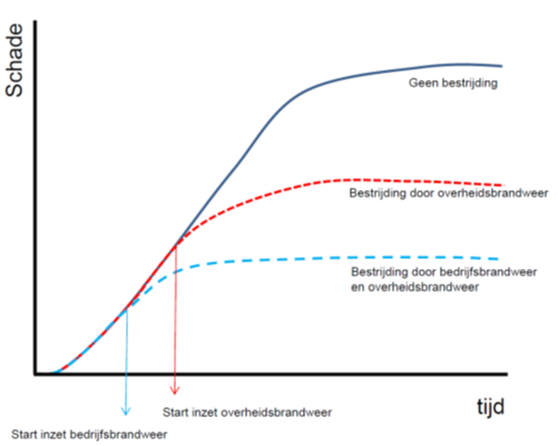 Los van het feit dat de overheidsbrandweer niet alle risico’s kan bestrijden vanuit de brandweerzorg, heeft de inzet van de bedrijfsbrandweer ook intrinsieke voordelen: een bedrijfsbrandweer is bijvoorbeeld beter dan de overheidsbrandweer bekend met de aanwezige installaties, processen en stoffen. Ook kan de bedrijfsbrandweer sneller ingezet worden, waardoor schade en gevolgen beperkt kunnen blijven en escalatie mogelijk wordt voorkomen (zie figuur 2).