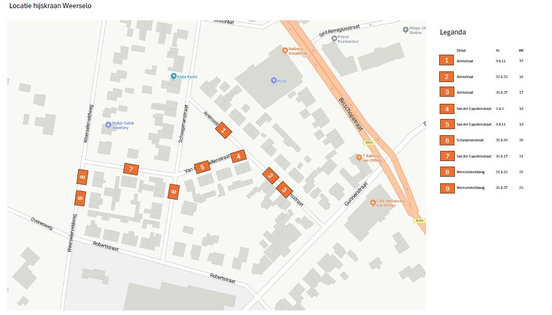 Van week 15 t/m week 23 vinden er werkzaamheden plaats in Weerselo aan de Weerselerveldweg, Ariénstraat, van Capellenstraat en de Schaepmanstraat waarbij een hijskraan de weg blokkeerd. Daarom vinden wij dat dit evenement de tijdelijke behoefte doet ontstaan om verkeersmaatregelen te treffen. De maatregelen zullen uitgevoerd worden van week 15 2025 t/m week 23 2025 (zie onderstaande tekening)