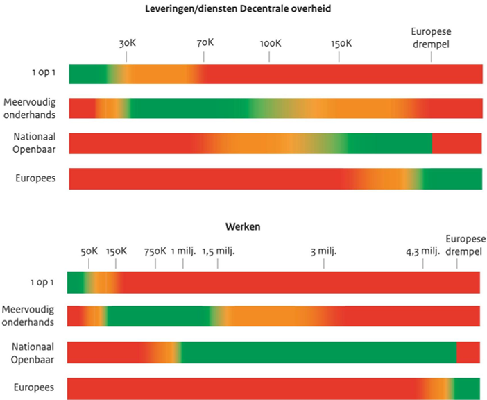 Jeugdregio Een 10 voor de Jeugd zal per inkoop bepalen welke inkoopprocedure zij gaat doorlopen. De te doorlopen inkoopprocedure wordt onderbouwd in de inkoopstrategie. Hiervoor wordt onder andere gebruik gemaakt van voorschrift 3.4A van de Gids Proportionaliteit en onderstaande balkenschema’s , waarin de meest gangbare procedures zijn opgenomen. Jeugdregio Een 10 voor de Jeugd kan ook andere dan de meest gangbare procedures toepassen.