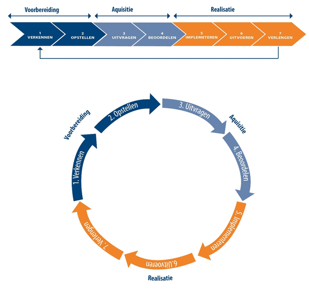 Het inkoopproces is een cyclisch proces waarbij de ervaringen vanuit eerdere inkoopprocessen input zijn voor nog te doorlopen inkoopprocessen. Het cyclische proces kent 3 hoofdfasen, met in totaal 7 stappen. In de voorbereidingsfase worden de inkoopstrategie en de inkoop-/aanbestedingsdocumenten opgesteld waarbij tevens de inbreng vanuit de contractmanagementfunctie wordt meegenomen. In de verwervingsfase wordt de inkoopprocedure doorlopen. In de verwerkelijking wordt de Opdracht uitgevoerd en vinden de contractmanagementactiviteiten plaats.