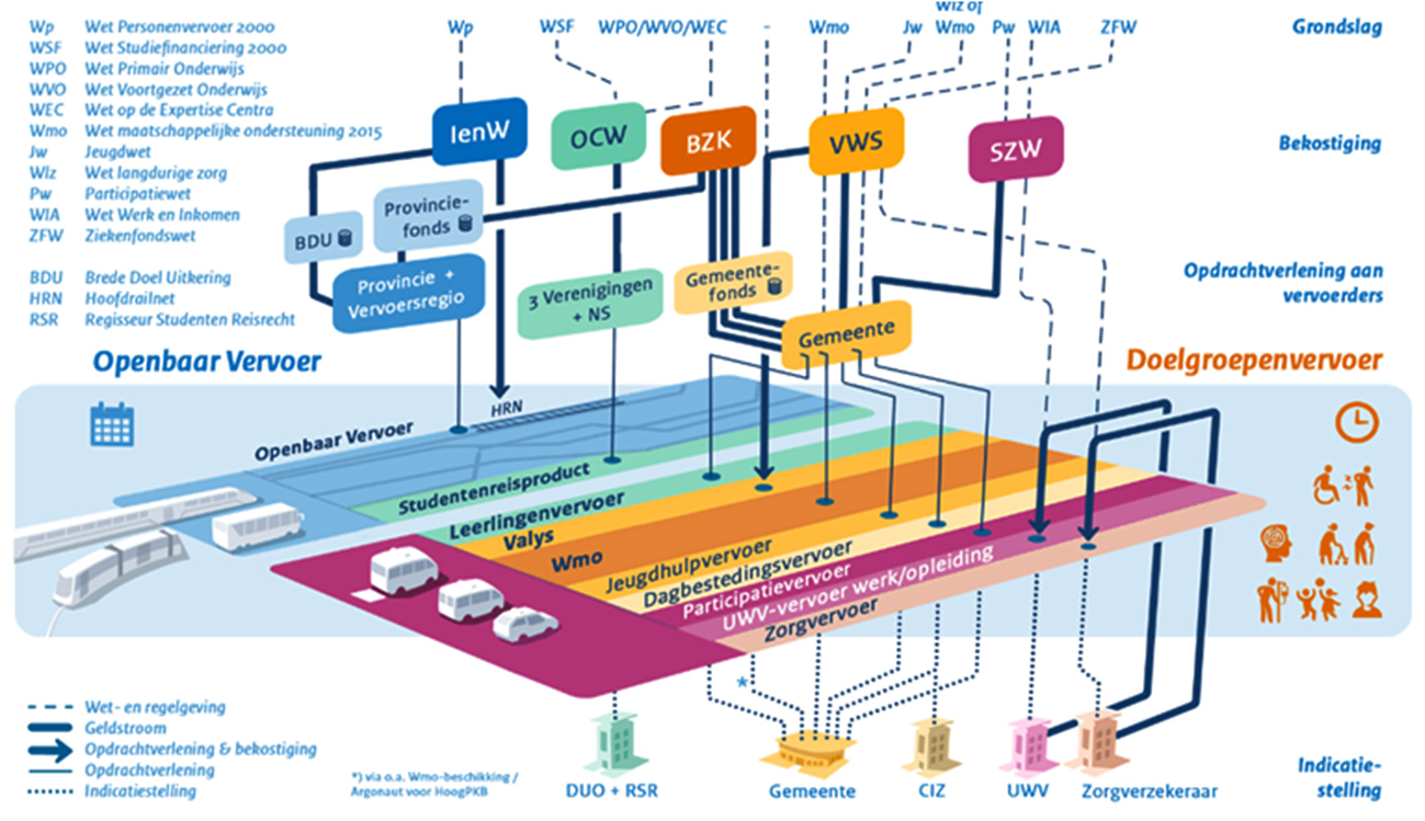 Onderstaande figuur geeft aan dat de huidige organisatie van publiek gefinancierde vervoersvormen zich kenmerkt door verschillende grondslagen, aansturings- en financieringsvormen.