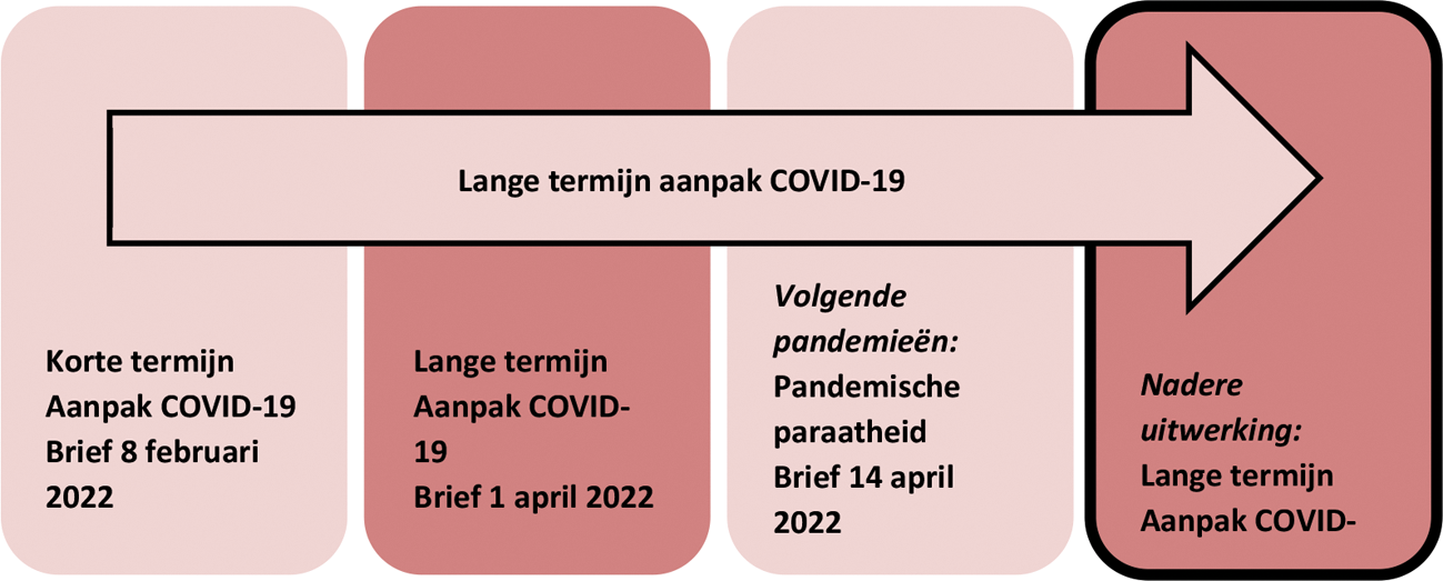 • In paragraaf 4 wordt ingezoomd op de zorg. Eén van de doelen van het coronabeleid ziet toe op de toegankelijkheid van de gehele zorgketen voor iedereen. Het is belangrijk dat de (reguliere) zorgketen goed kan blijven functioneren, ook bij een opleving van het virus. In paragraaf 4 wordt toegelicht welke stappen de overheid samen met de zorgsector zet om de zorgketen te optimaliseren.