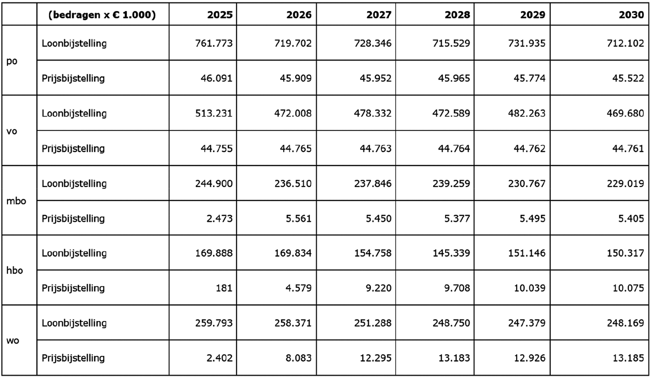 In onderstaande tabel staat de hoeveelheid geld voor verhoging van het personele deel en het prijsgevoelige deel van de bekostiging, tranche 2025. Dit betreft het totale budget voor de loon- en prijsbijstelling per sector. Werkgevers kunnen het budget voor de loonbijstelling inzetten voor de arbeidskostenontwikkeling. Deze informatie is tevens opgenomen in het Verslag houdende een lijst van vragen inzake de Wijziging van de begrotingsstaten van het Ministerie van Onderwijs, Cultuur en Wetenschap (VIII) voor het jaar 2025 (wijziging samenhangende met de Voorjaarsnota).12