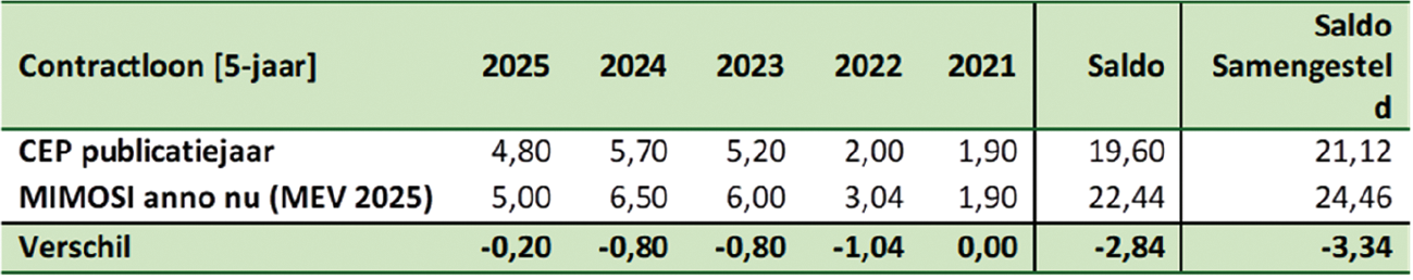 Het antwoord op de vraag of de geraamde cao-lonen in de marktsectoren afwijken van de daadwerkelijke cao-lonen, hangt af van de periode waarnaar wordt gekeken. De ramingen worden met terugwerkende kracht bijgewerkt. Het voorlopige beeld van de afgelopen vijf jaren (2025–2021) op basis van de huidige ramingen is inderdaad dat de cao-lonen in de markt hoger liggen dan destijds bij CEP geraamd. Samengesteld gaat het om circa 3,3 procent. Uit de evaluatie van het referentiemodel blijkt dat afwijkingen naar boven en beneden over de lange termijn uitmiddelen (2017, pagina 23).13