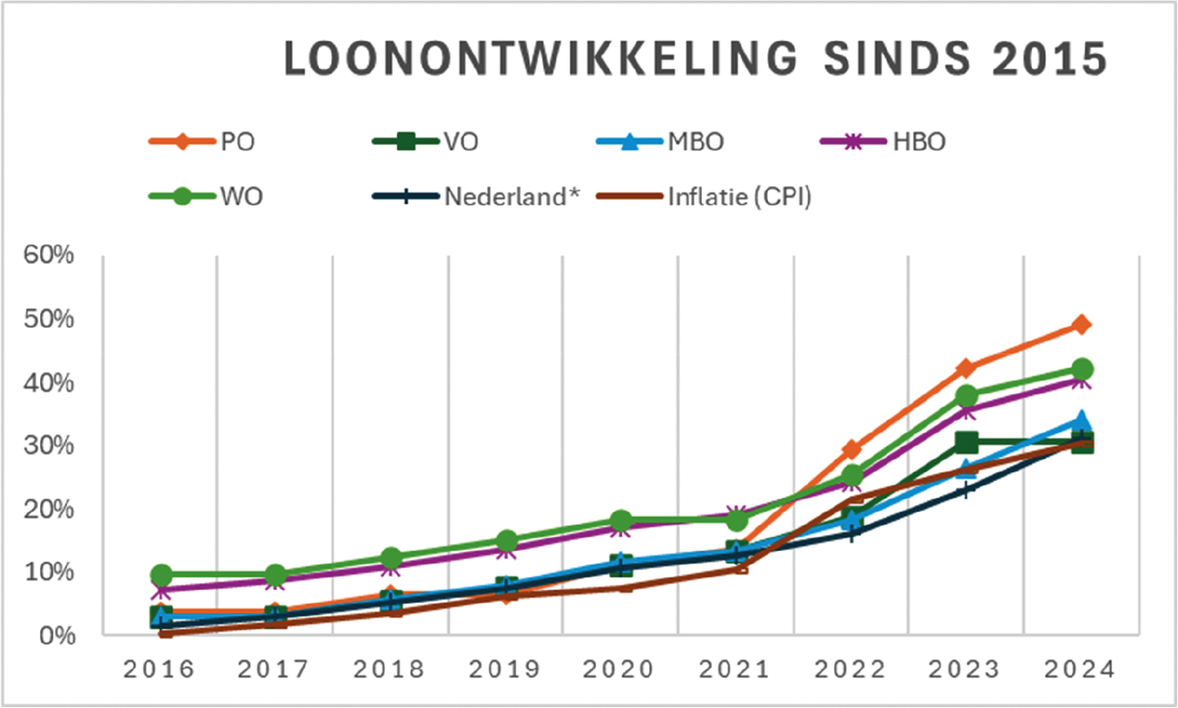 *Bron: De cijfers zijn samengestelde reeksen. De beloning is op basis van DUO-data en cao-ontwikkeling. De inflatie en loonontwikkeling zijn op basis van CPB-data, specifiek resp. het CPI en het contractloon in de markt.