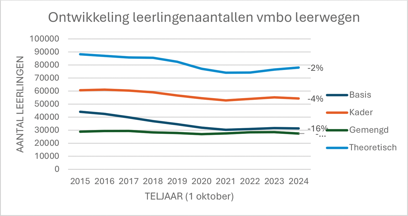 Het aanbod staat extra onder druk omdat er sinds de jaren 2010 sprake is van leerlingendaling, in het hele voortgezet onderwijs en in het bijzonder in het vmbo. Het aantal leerlingen in het beroepsgerichte vmbo is tussen 2017 en 2024 met ruim tien procent gedaald. De grootste percentuele daling is in die periode te zien in de basisberoepsgerichte leerweg, dat gaat om bijna 16 procent.17 De prognoses laten zien dat deze vmbo-aantallen verder zullen dalen, met uitschieters naar 16 procent daling tot 2040 in Drenthe, Friesland en Overijssel.18 Mede als gevolg van deze leerlingendaling zijn er steeds meer beroepsgerichte profielen met maximaal tien leerlingen per leerweg per vestiging en gemiddeld steeds minder leerlingen per profiel.19
