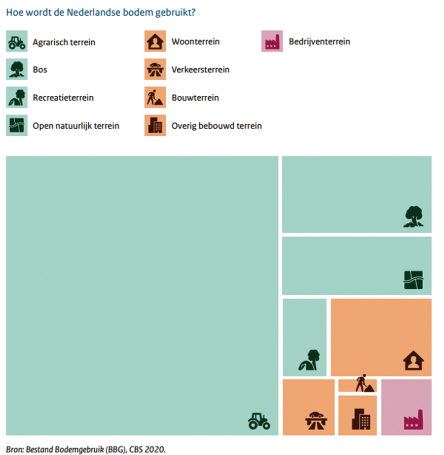 In Nederland heerst er een grote druk op de ruimte omdat veel urgente opgaven samenkomen op het beperkte grondgebied van Nederland. Denk aan de opgaven op het gebied van woningbouw, mobiliteit, energietransitie, klimaatverandering, landbouw, natuur en gezondheid. Bijgevoegde figuur uit de Nota Ruimte geeft inzicht in het bodemgebruik van ons land.12 Ongeveer een derde van het recreatieterrein is bestemd voor sport en een derde voor parken, waar onder andere gesport, bewogen en gespeeld kan worden. Ook in bossen en open natuurgebieden kan gesport en bewogen worden, maar de ruimte hiervoor is beperkt. De totale beschikbare ruimte voor sport en bewegen bedraagt daarmee ongeveer 2% van het grondoppervlak van Nederland.