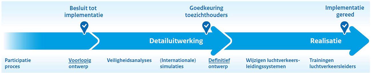 Het programma Luchtruimherziening hanteert een gefaseerde aanpak. In eerdere fases is veel contact geweest met provincies, omwonenden van luchthavens, de luchtvaartsector en andere betrokkenen. Met het Schetsontwerp publiceert het kabinet het ontwerp voor de nieuwe indeling van het Nederlandse luchtruim. Hiermee worden omwonenden en andere belangstellenden geïnformeerd over de plannen. De besluitvorming vindt op een later moment plaats. In onderstaande figuur zijn de stappen opgenomen die moeten leiden tot besluitvorming en realisatie van de nieuwe indeling. De belangrijke momenten hierin zijn: