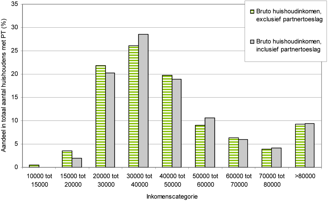 De figuur laat zien dat het grootste deel van de AOW’ers die partnertoeslag ontvangen (ca. 75%) een bruto huishoudinkomen boven de € 30 000 (ca. 167% van het WML uit 2009) heeft.