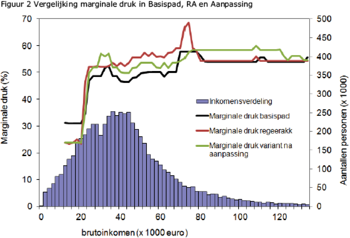 Het stuk geeft geen bronverwijzing voor de figuur. Is deze afkomstig van de regering? Zo nee, denkt de regering niettemin dat deze figuur ongeveer correct is? Wat betreft het aangepaste RA (maar overeenkomstige opmerkingen gelden de andere drukpercentages) zien we een sterke marginale belastingdrukstijging vanaf ongeveer € 20 000 met een relatief hoogtepunt tussen € 32 000 en € 36 000. Boven de € 120 000 daalt de marginale druk tot onder dat punt. Er wordt wel gesteld dat marginale drukstijging een negatieve invloed op het aanbod van arbeid heeft. Onderschrijft de regering deze stelling? Zo ja, verwacht de regering dan op termijn een daling van het aanbod van arbeid bij inkomens van € 20 000 tot € 32 000? Verwacht de regering op termijn ook een stijging van het aanbod van arbeid bij inkomens boven € 120 000? (Bedoeld is uiteraard een effectieve stijging.)