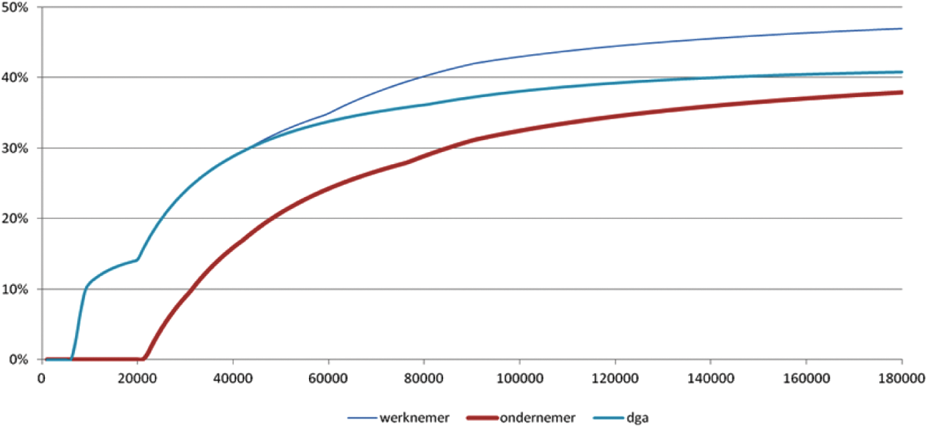 In deze figuur wordt voor de dga gerekend met het reguliere box 2-tarief van 25%. In 2014 bedraagt dat tarief voor de eerste € 250.000 echter 22%. Daarnaast kan het effectieve box 2-tarief veel lager liggen omdat een dga de mogelijkheid heeft om de heffing in box 2 uit te stellen. Naarmate dat uitstel langer is, zal het effectieve tarief lager zijn. De gemiddelde belastingdruk van de dga zal daardoor in de praktijk, bij hogere inkomens, lager kunnen liggen dan weergegeven in de figuur.