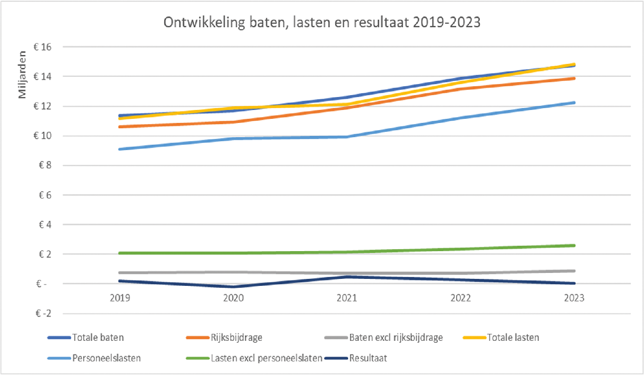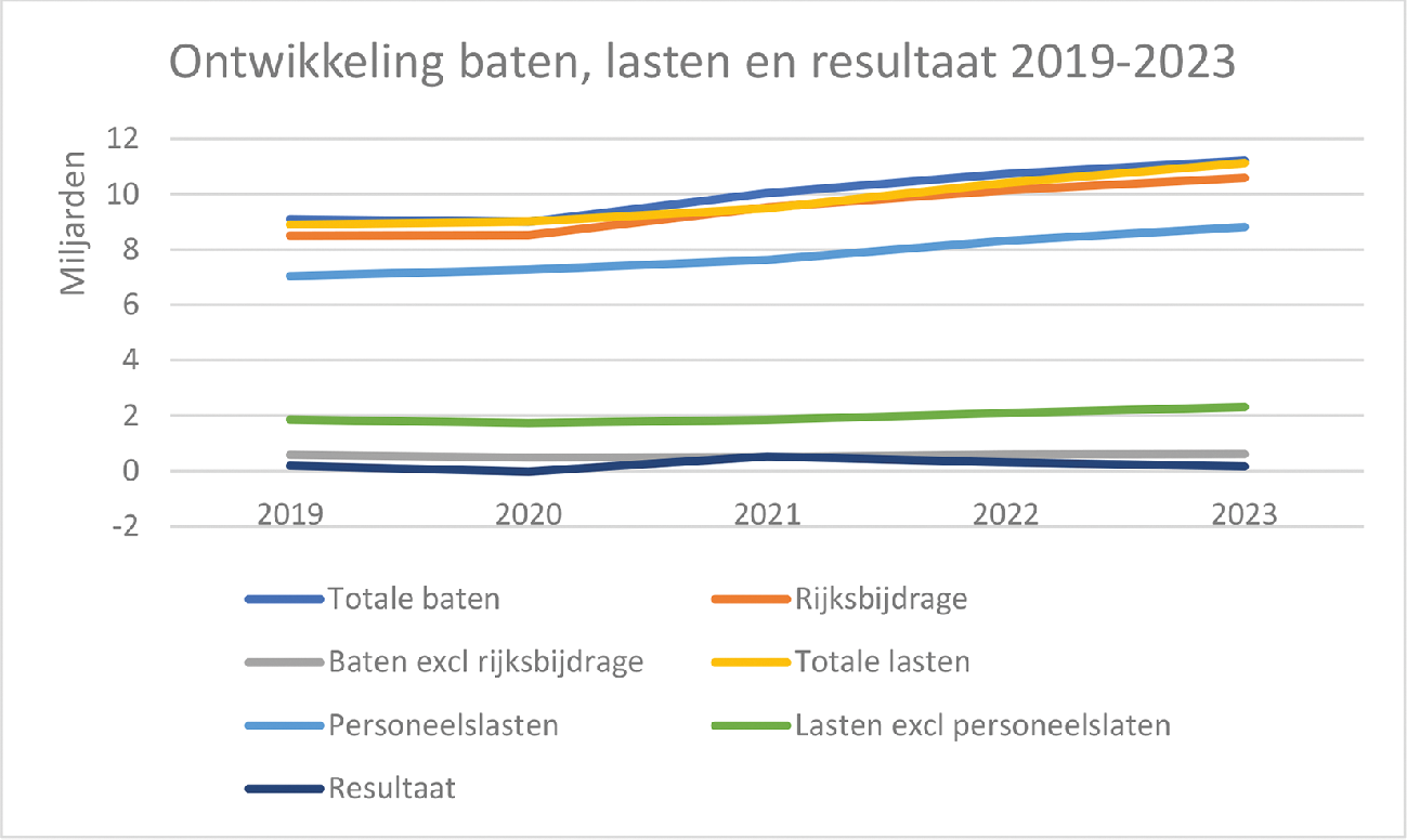 In de onderstaande figuur staat de ontwikkeling van baten, lasten en resultaat van het hele onderwijs in de afgelopen 5 jaar. Er is een trendbreuk in 2021 en 2022, bij de rijksbijdragen en het resultaat. Ondanks de hogere rijksbijdragen, ook in 2023, is het resultaat aanzienlijk lager dan in de 2021 en 2022. Dat blijkt ook uit de rentabiliteit over 2023, vergeleken met de 2 voorgaande jaren.