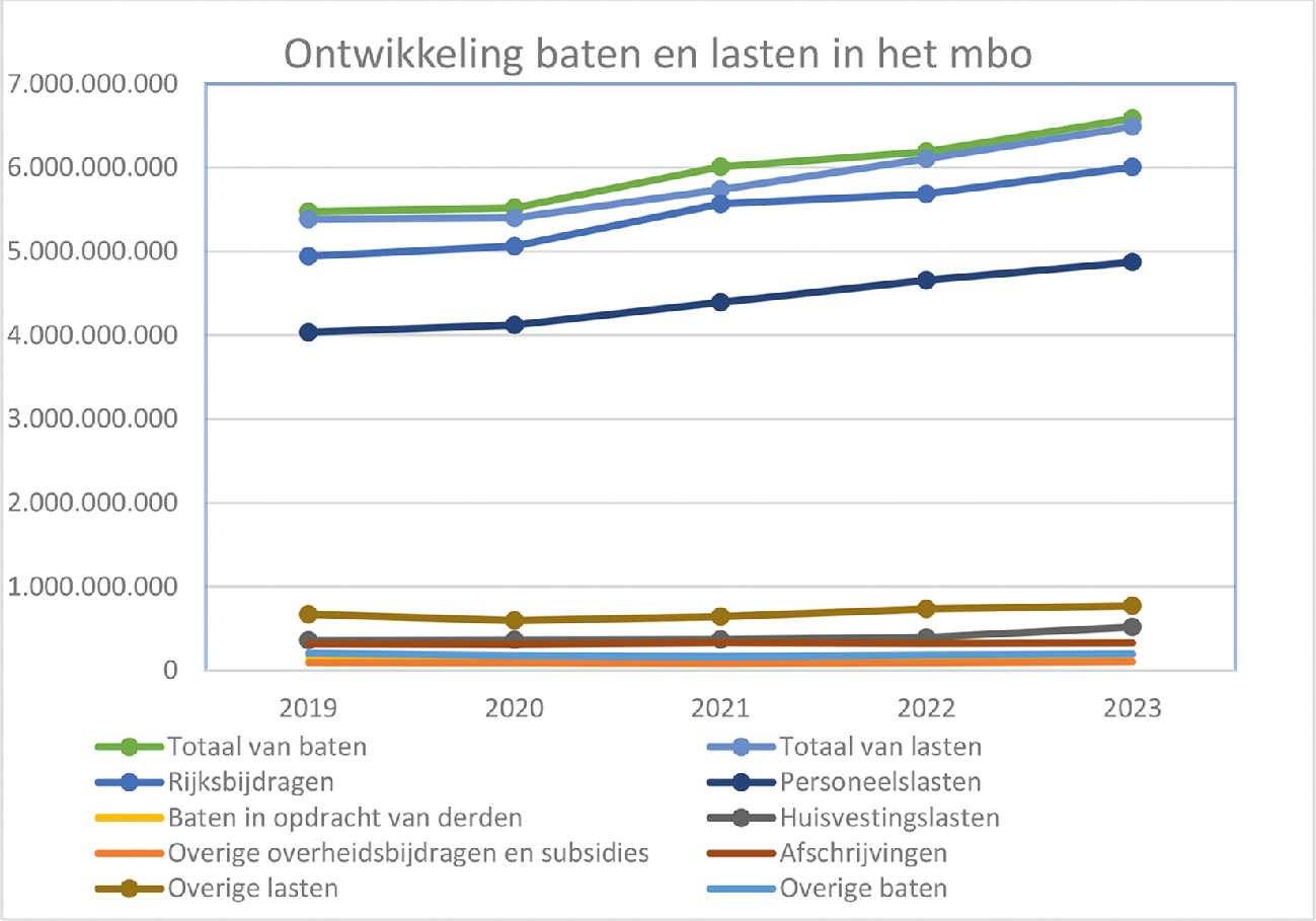 De totale personeelslasten stegen harder in 2023. Toch lukte het de onderwijsbesturen, vooral in het voorgezet onderwijs (vo), middelbaar beroepsonderwijs (mbo) en hoger beroepsonderwijs (hbo), niet om alle extra baten in te zetten in 2023.