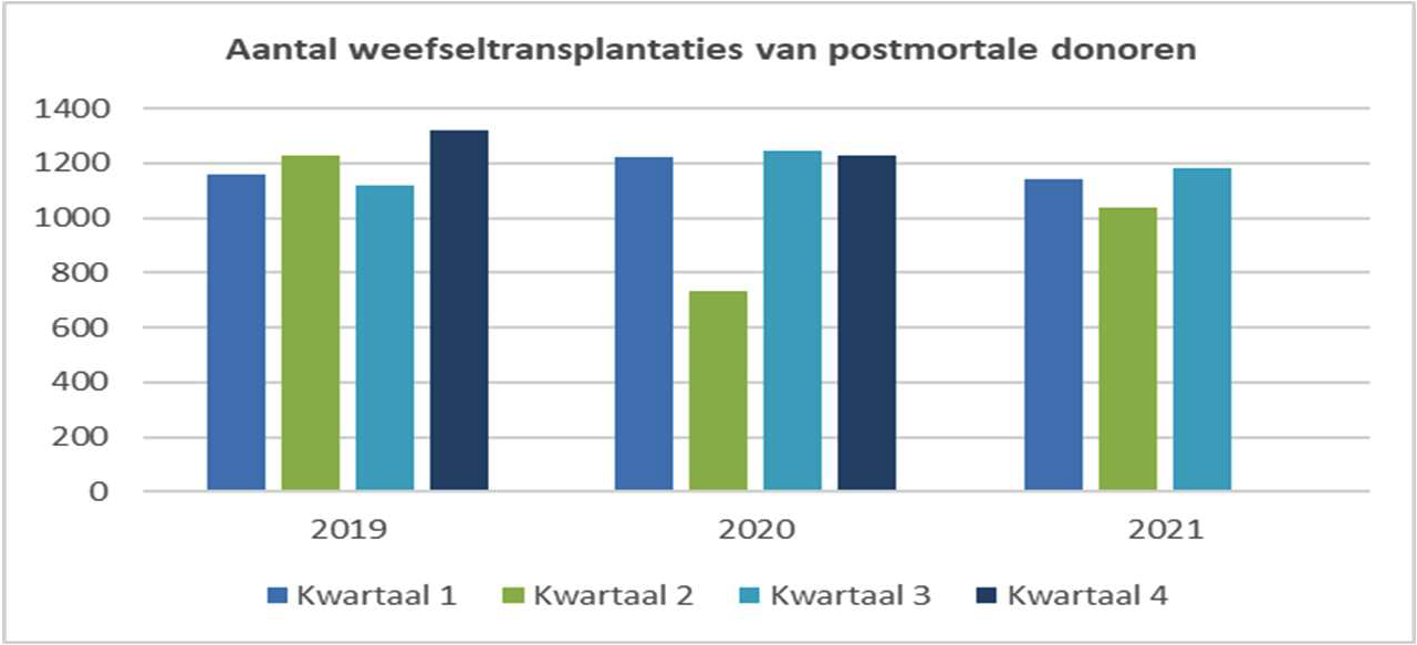 Het aantal weefseltransplantaties is weinig veranderd ten opzichte van voor de invoering van de nieuwe Donorwet, enkel in kwartaal 2 van 2020 werd door de beginnende Coronacrisis minder weefsel getransplanteerd.