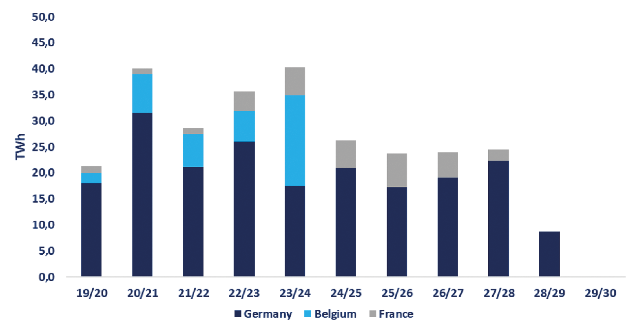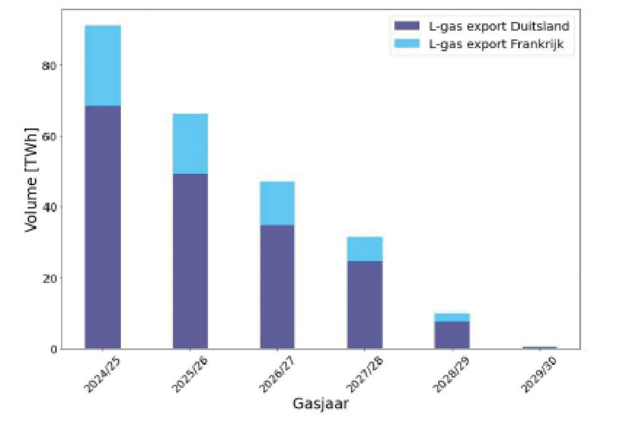 De onderstaande grafiek uit de raming van GTS voor gasjaar 2024–2025 geeft de verwachte L-gas export weer naar Duitsland en Frankrijk in de komende gasjaren (de export naar België stopt in het huidige gasjaar).