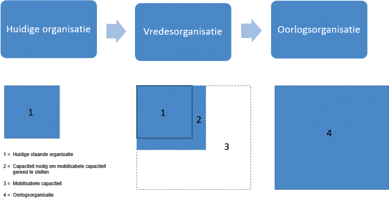 Defensie bouwt een schaalbare krijgsmacht. Modelmatig krijgt de schaalbare krijgsmacht vorm door de huidige organisatie binnen de kaders van het beschikbare defensiebudget door te ontwikkelen naar een vredes- en een oorlogsorganisatie. De vredesorganisatie bevat naast de huidige organisatie het extra personeel, de uitrusting, het vastgoed en het materieel dat nodig is om de mobilisabele eenheden die deel uitmaken van de oorlogsorganisatie op te leiden en gereed te stellen. Schaalbaarheid organiseren we met volledig en deels mobilisabele eenheden en door intensievere en geïntegreerde samenwerking met civiele partners. De mobilisabele personeelscapaciteit zal grotendeels bestaan uit reservisten, maar ook uit schaalbare burgercapaciteit. Het merendeel hiervan wordt in vredestijd slechts opgeroepen om te oefenen, zodat deze capaciteit tijdig gereed is zodra die nodig is.