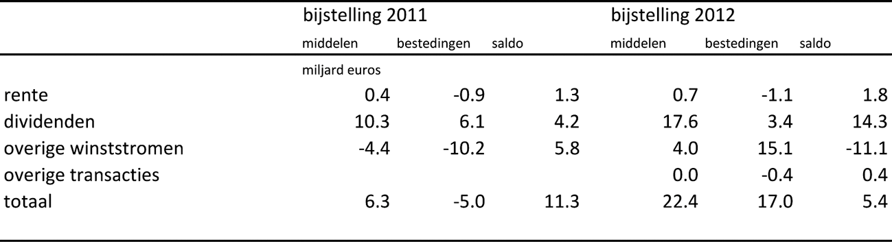 De verschillen in het thans door het CBS en DNB gepubliceerde primaire inkomen voor jaren 2010 en eerder zijn dusdanig beperkt van omvang (over de jaren 2008–2010 ligt dit verschil gemiddeld rond de 1,4 mld. per jaar) dat hiernaar geen verder onderzoek zal worden gedaan. Dit betekent niet dat de 2010-bni-raming voor de afdracht niet meer zou kunnen wijzigen. Eurostat heeft namelijk voor dit jaar een algemeen voorbehoud opgelegd. Als Eurostat, na verificatie, voor 2010 specifieke voorbehouden plaatst, zal op basis hiervan nog een aanpassing kunnen volgen. Daarnaast geldt voor Nederland, net als voor alle andere EU-lidstaten, een voorbehoud bij de bni-berekening voor het onderdeel winsten uit beleggingsinstellingen. Op basis van nieuwe betalingsbalansgegevens is hiervoor een herberekening gemaakt. Voor de periode 2006–2010 leidt dit cumulatief tot een beperkte neerwaartse bijstelling van het bni van Nederland met ongeveer 0,5 mld euro.