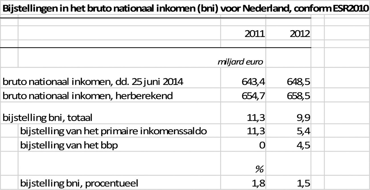 Het CBS heeft op 29 april 2014 de eerste, voorlopige uitkomsten van het gezamenlijk onderzoek met DNB naar buiten gebracht. Hierin staan ook de voorlopige herziene cijfers voor het BNI voor de verslagjaren 2011 en 2012. Onderstaande tabel geeft een overzicht van de bijstellingen BBP en BNI voor de verslagjaren 2011 en 2012.