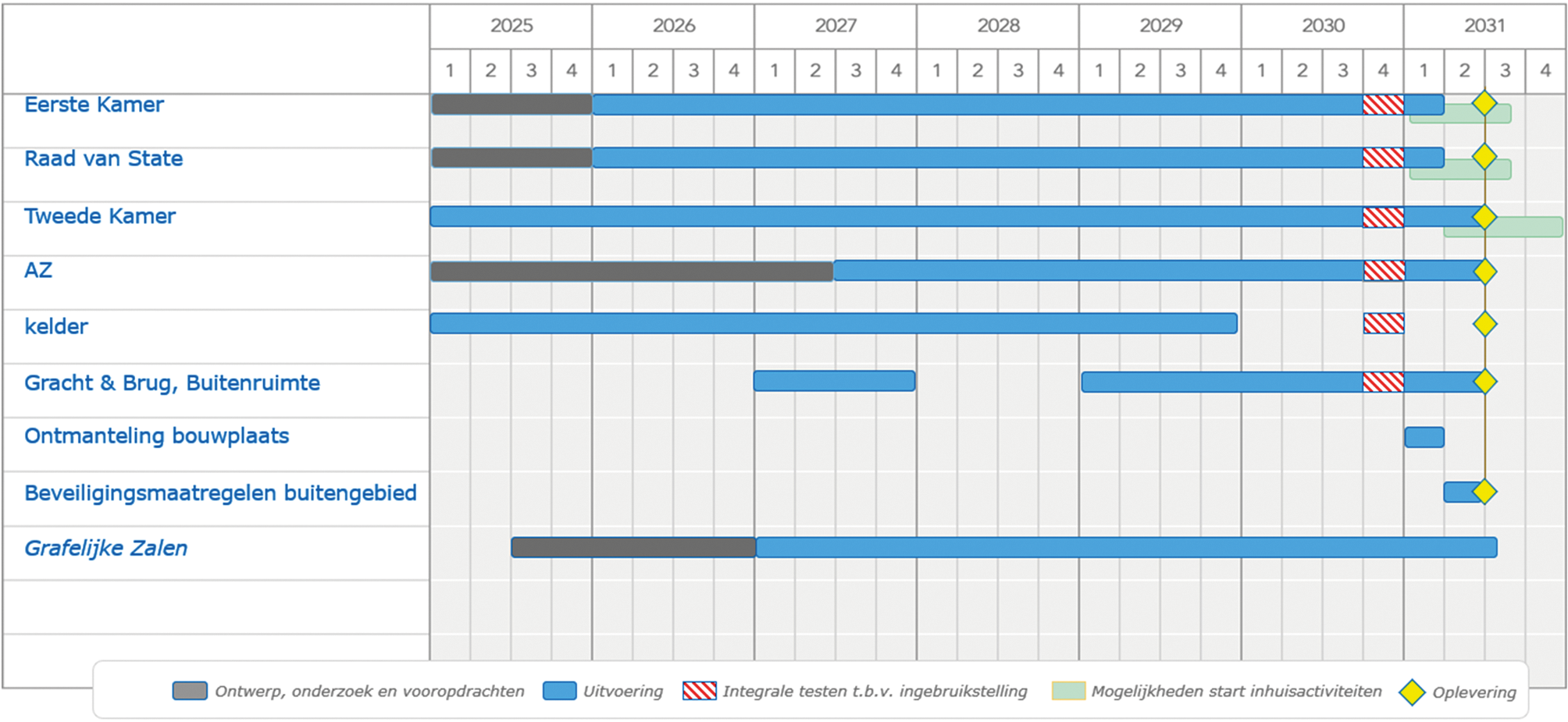 In deze planning is eind 2030 een belangrijk moment voorzien. Voordat de gemeente een vergunning kan verlenen voor de ingebruikname zullen de nieuwe installaties en het gebouw in bedrijf worden gesteld en integraal getest moeten worden. Deze periode van testen zal ongeveer 3 maanden in beslag nemen. Het complex moet hiervoor leeg zijn en pas na deze testen kan de bouwschutting rondom het Binnenhof worden verwijderd. De laatste werkzaamheden waaronder het aanleggen van beveiligingsmaatregelen in het buitengebied, de werkzaamheden in de buitenruimte onder meer voor de ingangen van de complexen, en het verwijderen van de bouwschuttingen zijn voorzien in de eerste helft van 2031. Het RVB zal op basis van deze planning, in de zomer van 2031 de complexen over kunnen dragen aan de gebruikers.