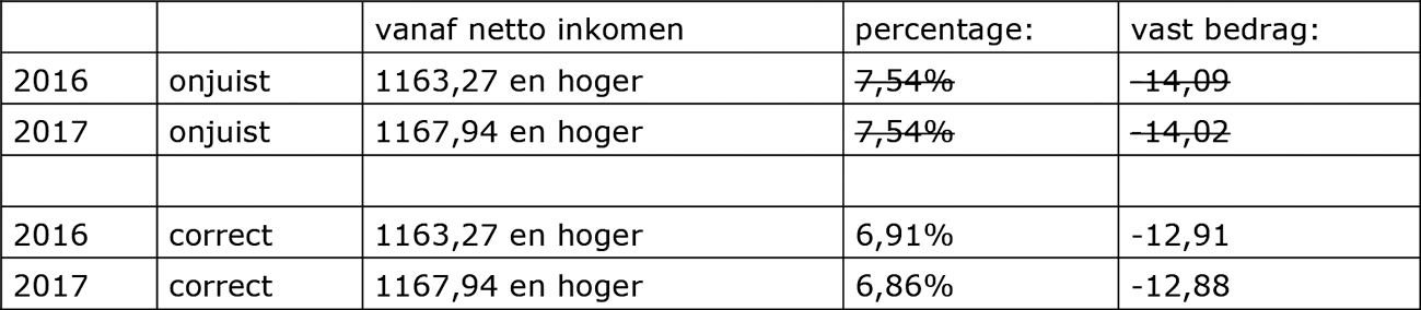 In onderstaande tabel staat aangegeven welke inkomenscategorie het betreft in de jaren 2016 en 2017. Het gaat om de hoogste inkomenscategorie in artikel 12. Mensen die het betreft zijn mogelijk benadeeld tot een bedrag dat kan oplopen tot maximaal netto € 7,50 per maand.