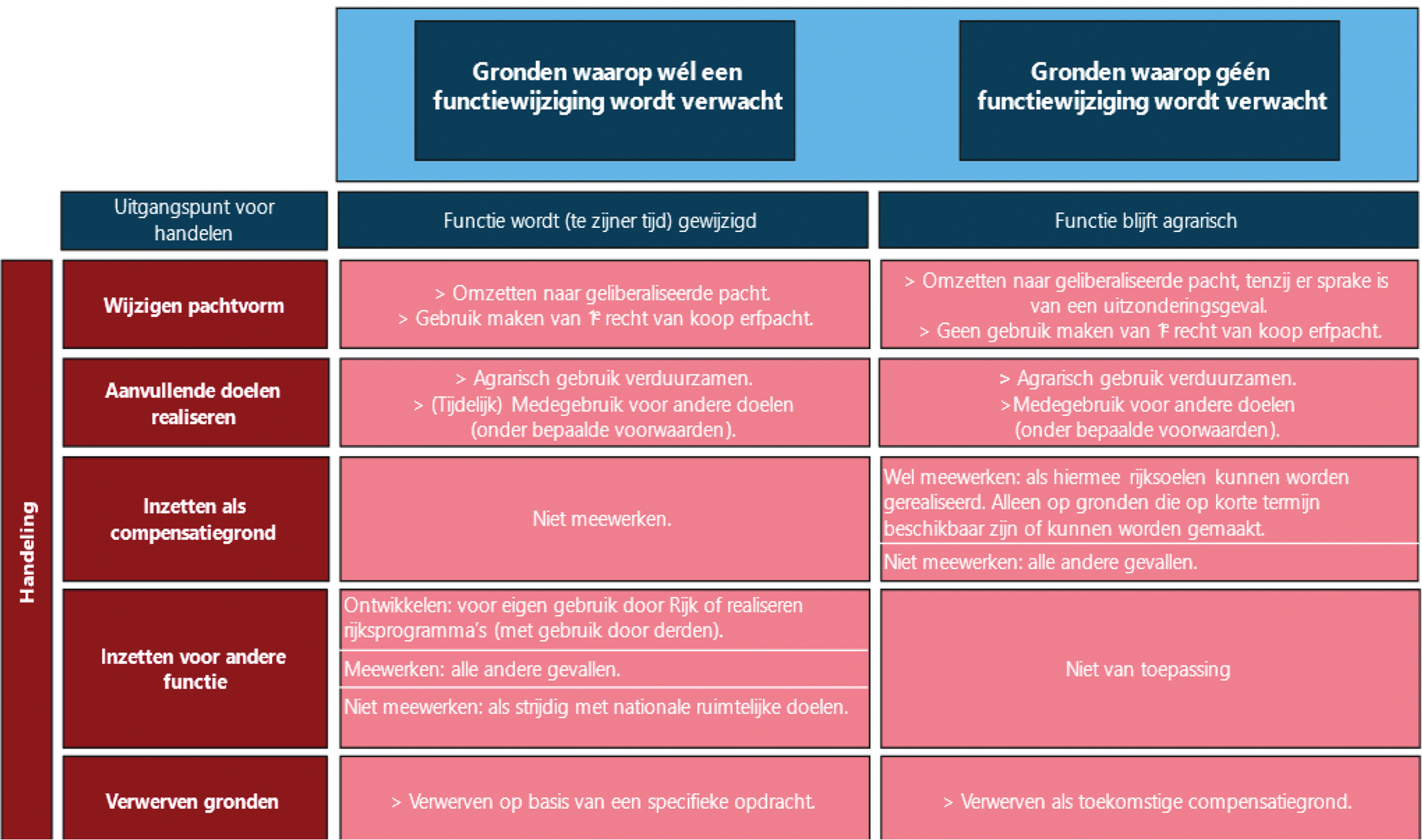 • Grond waarop géén functiewijziging wordt verwacht, die in geliberaliseerde pacht is uitgegeven of waarvan de pachtperiode kort voor de beoogde functiewijziging elders afloopt, kan worden ingezet als compensatiegrond. Tot nu toe geldt de voorwaarde dat de functie waarvoor het agrarisch bedrijf plaats moet maken, bedoeld is voor eigen gebruik door het Rijk, zoals voor de aanleg van rijksinfrastructuur of huisvesting van rijksdiensten, of voor realisatie van natuur door/in opdracht van provincies.