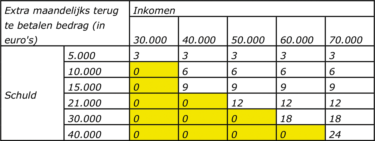 Onderstaande tabel toont wat een oud-student maandelijks extra terug moet betalen naar hoogte van studieschuld en inkomen. Ook de gevolgen voor oud-studenten die een hogere schuld hebben, omdat zij niet (tijdig) het voor de prestatiebeurs vereiste diploma hebben behaald, kunnen uit de tabel worden afgelezen. Ook voor hen zijn alle schuld- en inkomensposities denkbaar. De sociale terugbetaalvoorwaarden zorgen ervoor dat het terug te betalen bedrag in verhouding staat tot het inkomen. Wanneer het inkomen niet toereikend is om het bedrag terug te betalen dat bij de schuld hoort, betaalt de oud-student minder of niets terug.