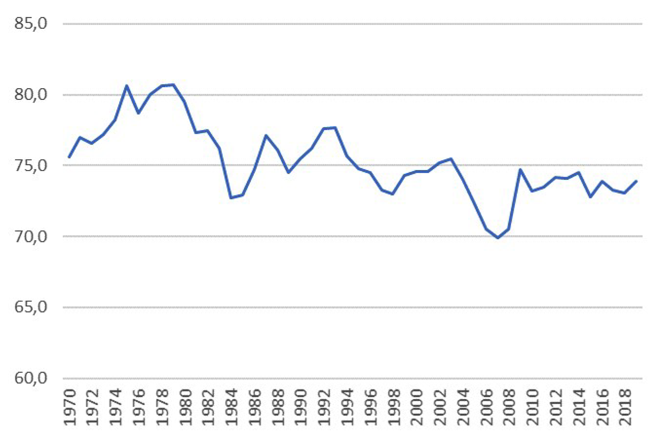 Ontwikkeling arbeidsinkomensquote (niveau in %) 1970–2019: